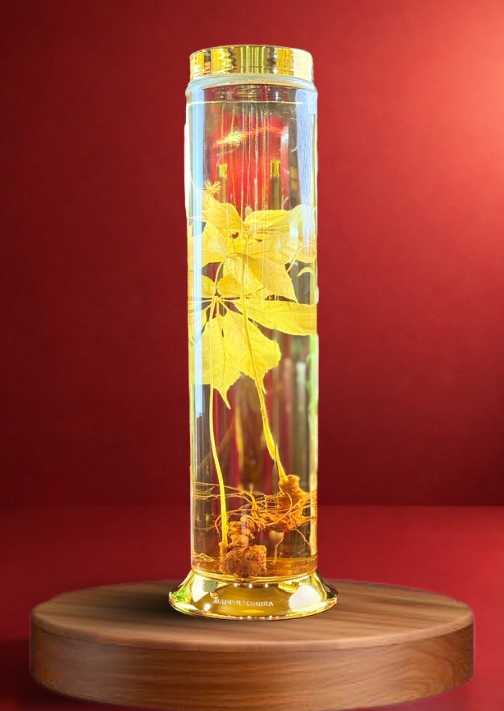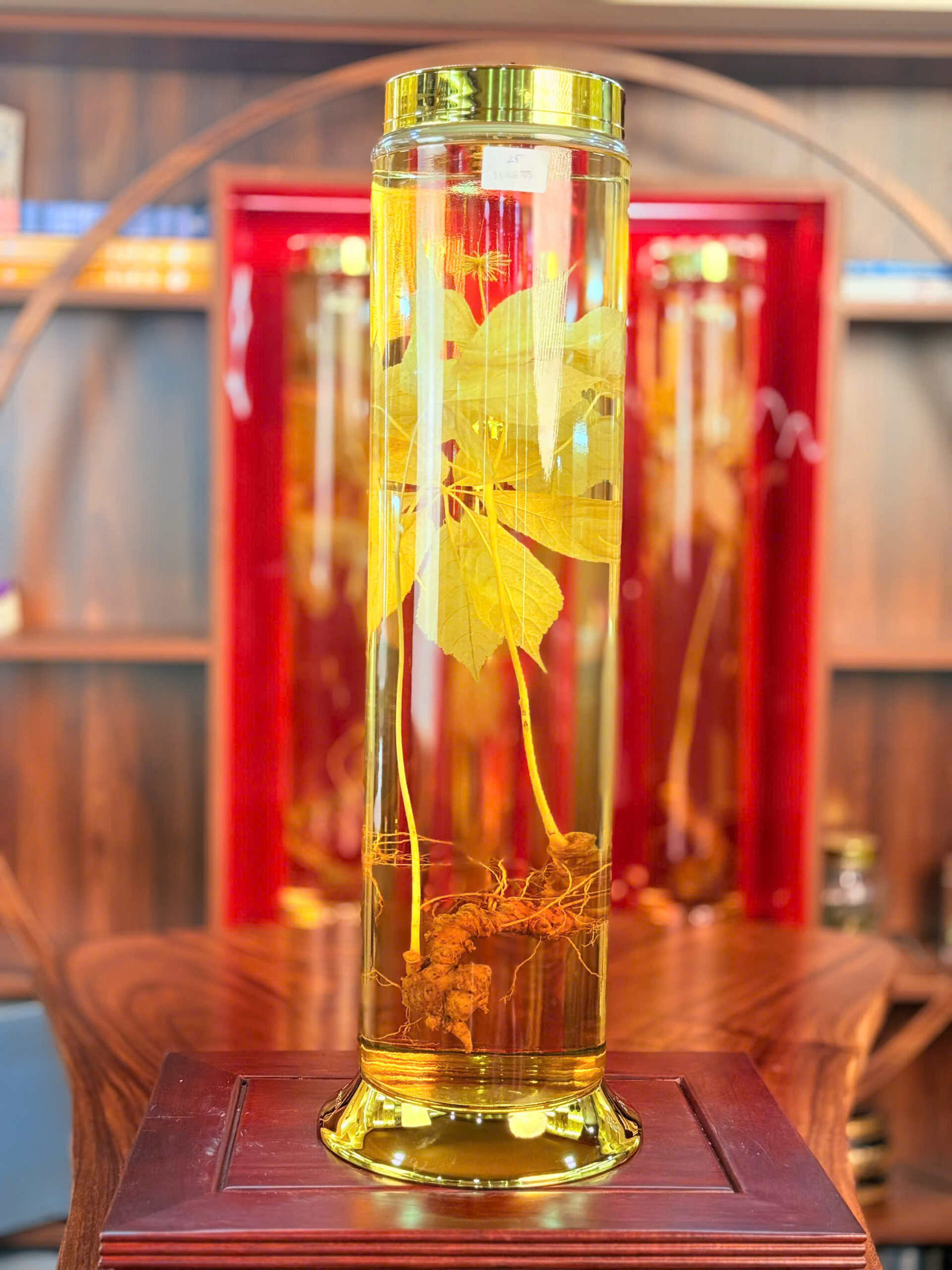 • Màu sắc: Bình rượu sâm màu vàng óng ánh, tự nhiên, không pha tạp chất. Củ sâm và lá vàng rực rỡ nổi bật bên trong bình, tạo vẻ đẹp nghệ thuật và quý phái.
