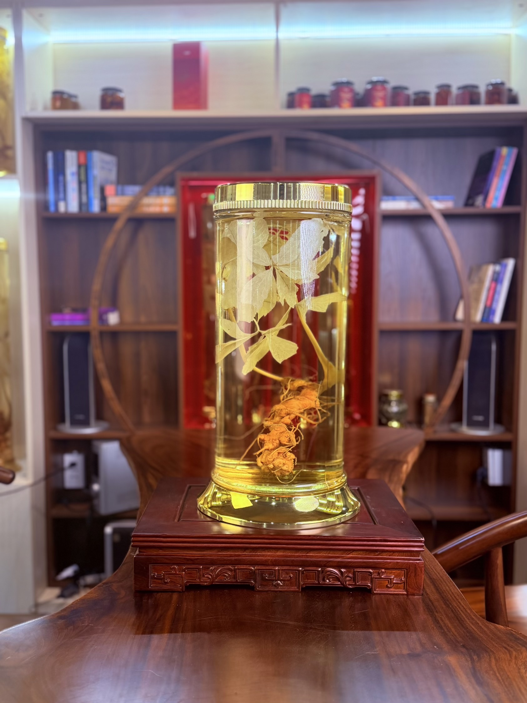 • Màu sắc: Bình rượu sâm màu vàng óng ánh, tự nhiên, không pha tạp chất. Củ sâm và lá vàng rực rỡ nổi bật bên trong bình, tạo vẻ đẹp nghệ thuật và quý phái.