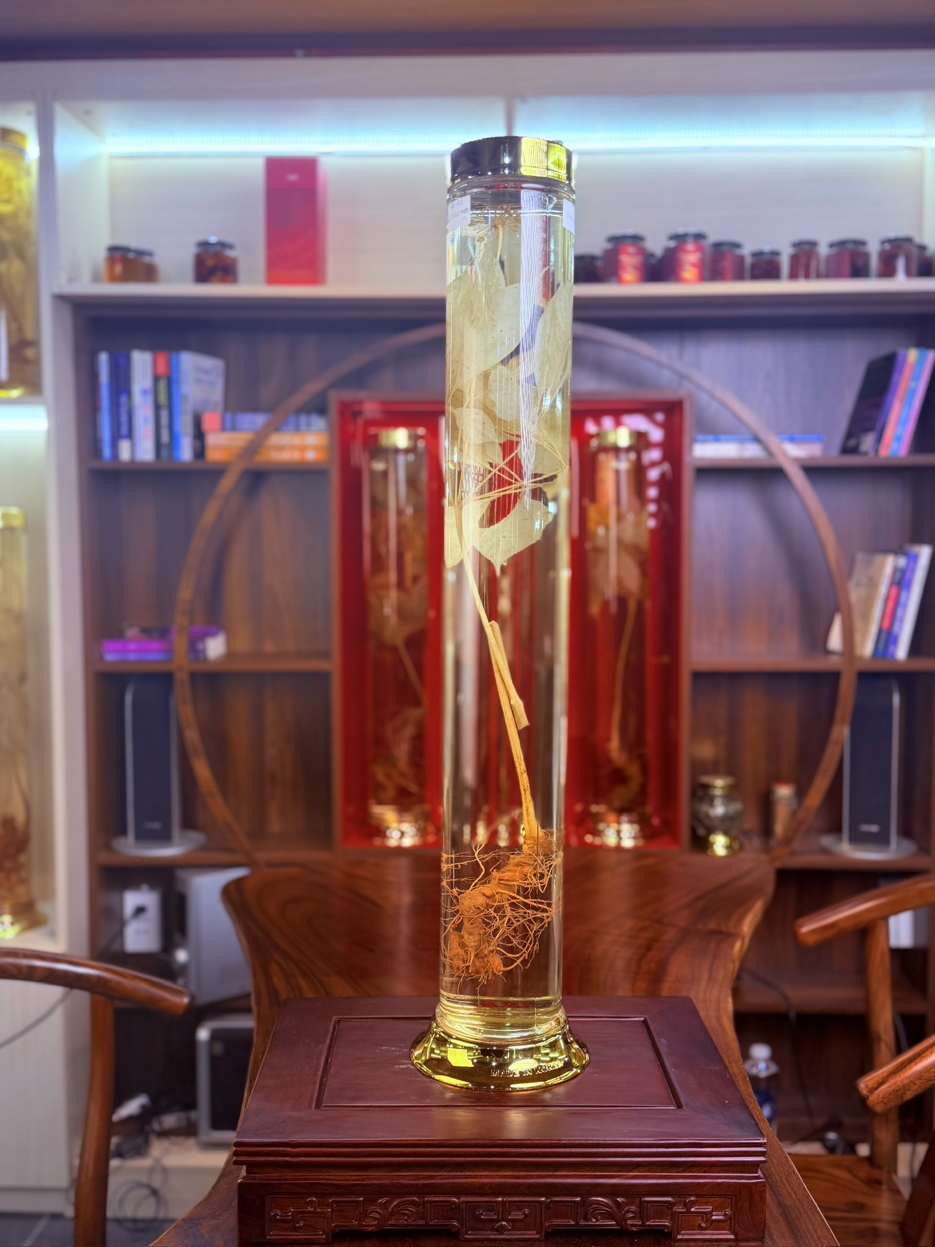 Sâm Ngọc Linh cây tươi được thu hoạch thủ công, sơ chế ngay lập tức để giữ nguyên dưỡng chất. Cây sâm được ngâm trực tiếp trong rượu nền chất lượng cao (thường rượu lúa rẫy địa phương, khử andehit), theo tỷ lệ chuẩn để chiết xuất tối đa hoạt chất quý. Quá trình ngâm diễn ra trong bình thủy tinh cao cấp, kín khí, giúp bảo quản lâu dài mà không mất dược tính. Bình rượu được thiết kế trụ đứng cao, nắp vàng sang trọng, tạo hiệu ứng trưng bày đẹp mắt với hình ảnh cây sâm Ngọc Linh vàng óng ánh lơ lửng trong bình trong suốt.