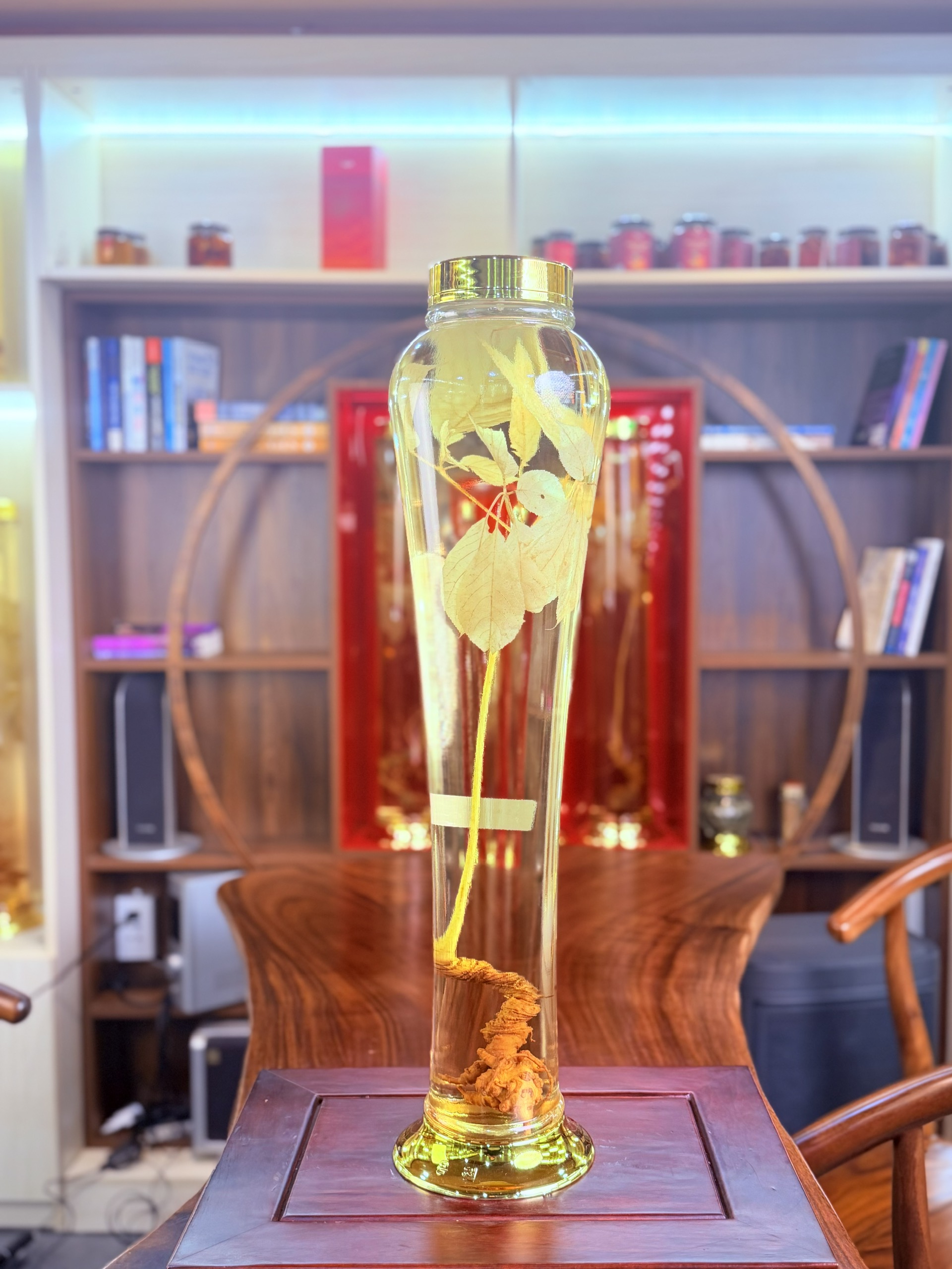 • Màu sắc: Bình rượu sâm màu vàng óng ánh, tự nhiên, không pha tạp chất. Củ sâm và lá vàng rực rỡ nổi bật bên trong bình, tạo vẻ đẹp nghệ thuật và quý phái.