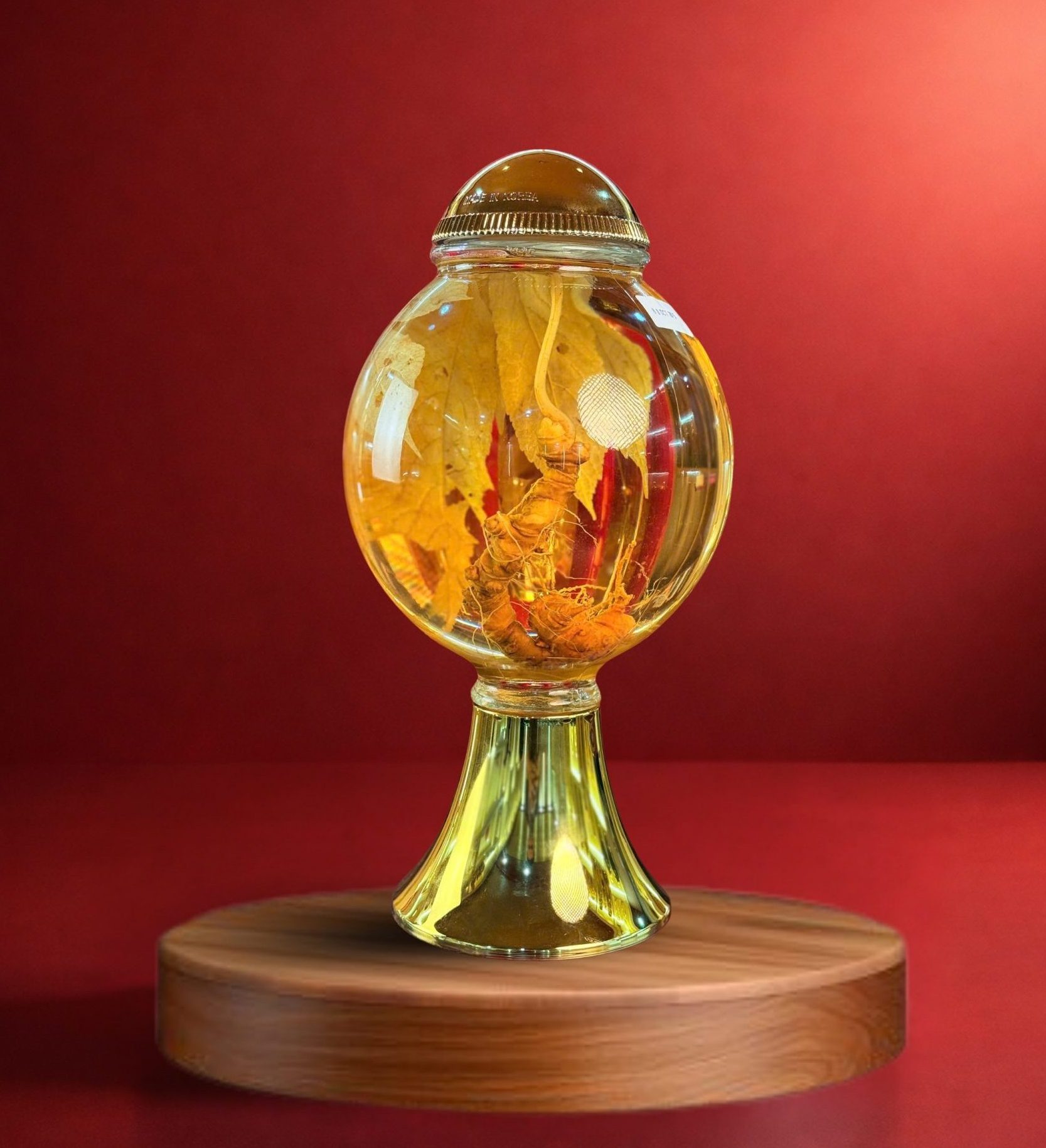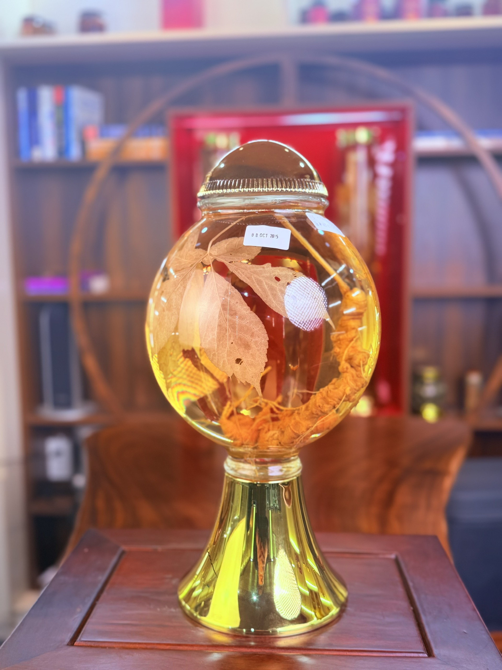• Màu sắc: Bình rượu sâm màu vàng óng ánh, tự nhiên, không pha tạp chất. Củ sâm và lá vàng rực rỡ nổi bật bên trong bình, tạo vẻ đẹp nghệ thuật và quý phái.