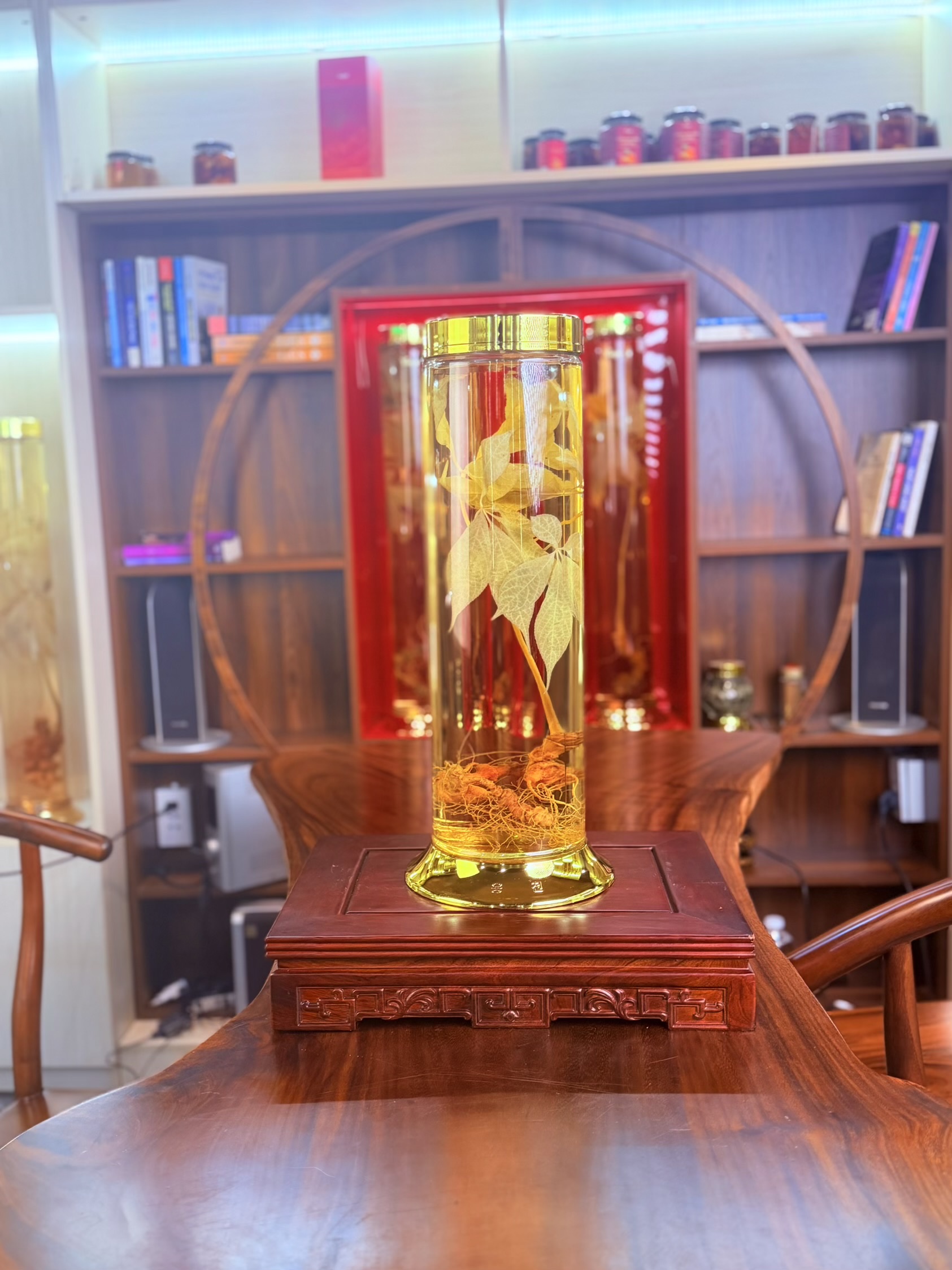 Là tuyệt phẩm cao cấp từ thương hiệu Vinaplo, kết hợp tinh hoa của Sâm Ngọc Linh quý hiếm – “Quốc bảo Việt Nam” – được ngâm nguyên cây có cả củ, thân, lá và hoa trong bình thủy tinh sang trọng. Sản phẩm không chỉ là thức uống bổ dưỡng mà còn là món quà biếu ý nghĩa, vật phẩm trưng bày đẳng cấp cho không gian phòng khách, bàn làm việc hay quầy lễ tân.