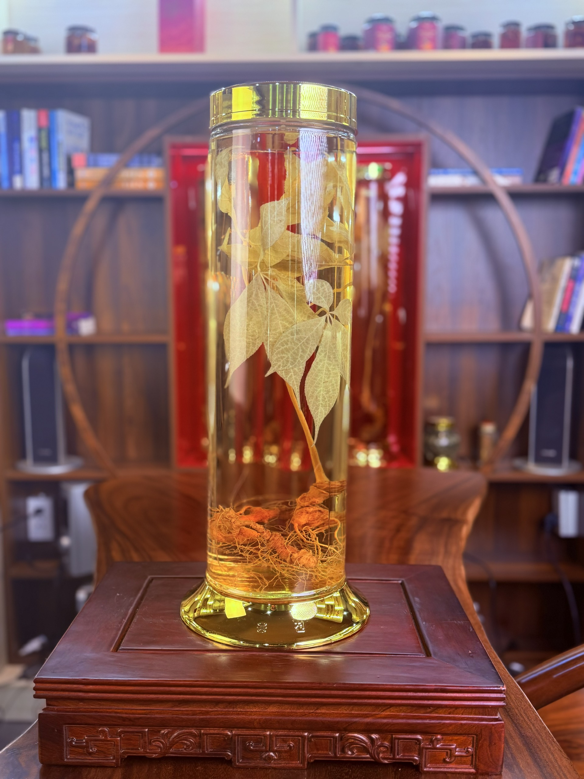 • Màu sắc: Bình rượu sâm màu vàng óng ánh, tự nhiên, không pha tạp chất. Củ sâm và lá vàng rực rỡ nổi bật bên trong bình, tạo vẻ đẹp nghệ thuật và quý phái.